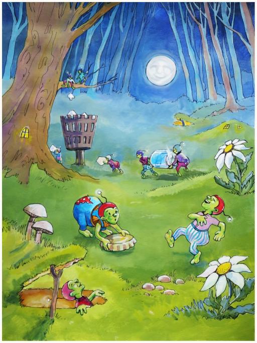 An illustration for a children's book - awaiting approval by the author. There have been a few changes already so I doubt this will be the final version. These are the little creatures that live underground and come out at night to tidy up the parks and woodlands.